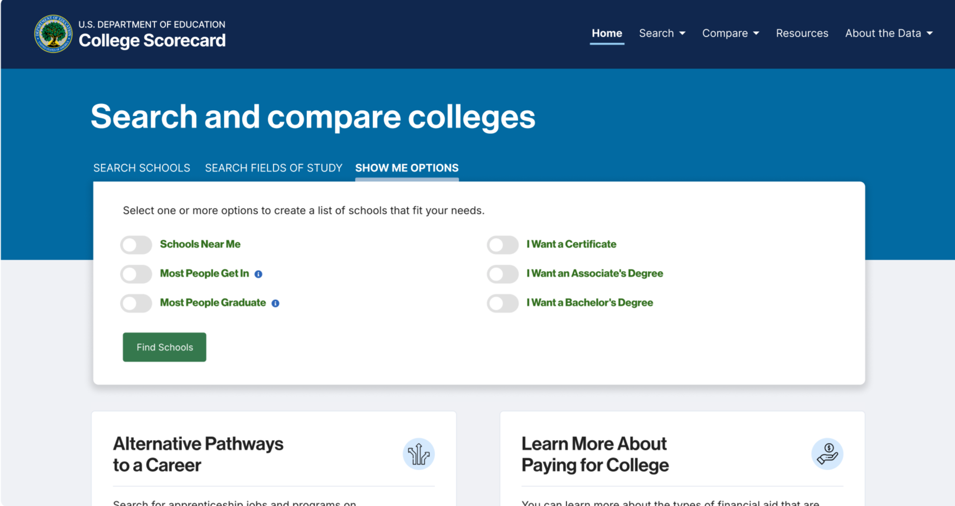 The Department of Education tasked my team at RTI International with identifying these barriers through comprehensive user research and redesigning the experience to better serve students at every stage of their college search journey.