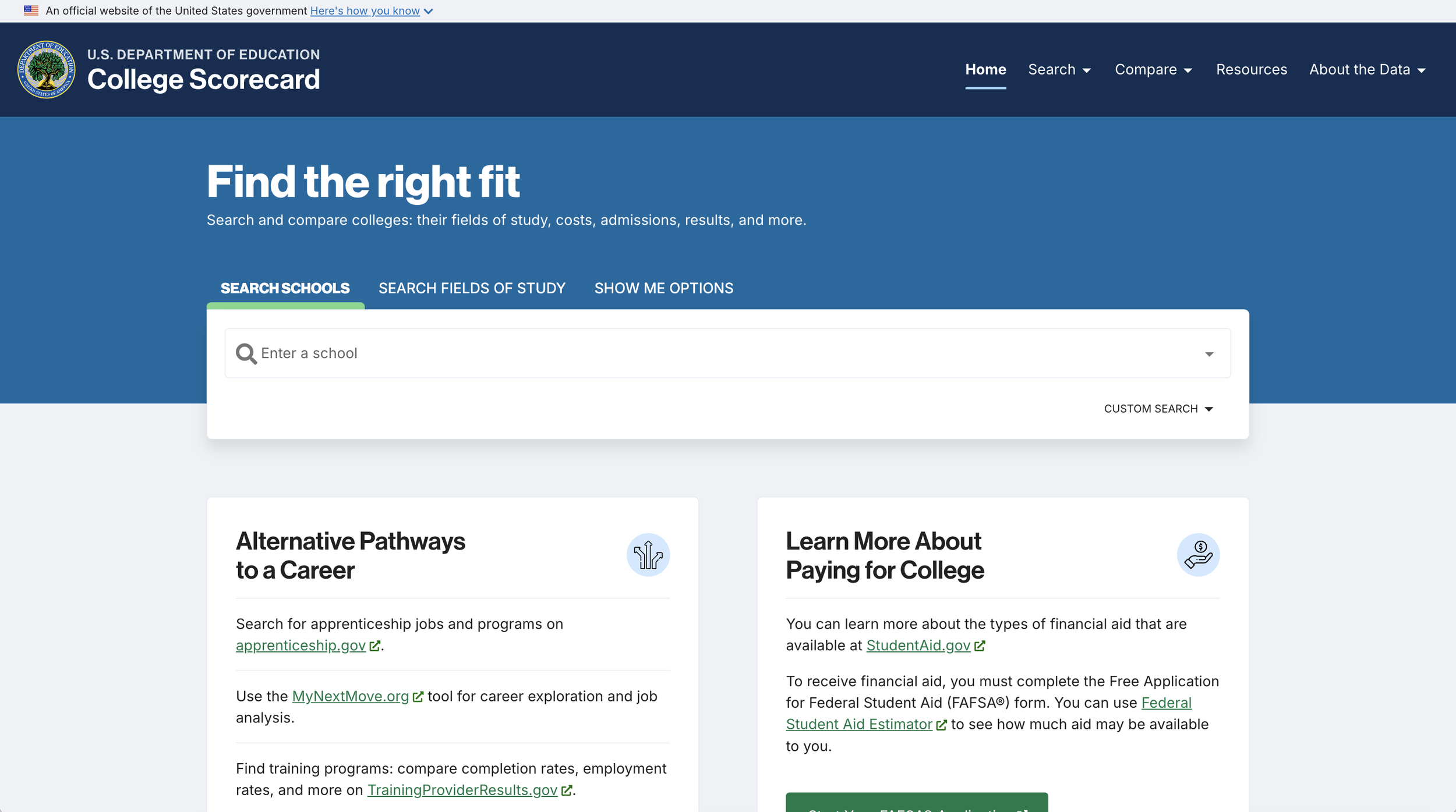 Redesign the College Scorecard homepage to emphasize the search bar and include additional information above the external links about how to use the College Scorecard and the scope of its offerings